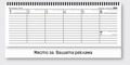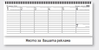 На календарите са отбелязани всички официални празници и именни дни. Телата на календарите са стандартни и не подлежат на промяна. Тяло: 56 страници,офсет 70 g/m2, метална спирала Корица: 300 g/m2, картон Zenit Размери на тялото: 110 х 290 мм Размери в готов вид: 135 х 290 мм Рекламна площ на долна корица - 20 х 290 мм Рекламна площ на горна корица - 100 х 290 мм |